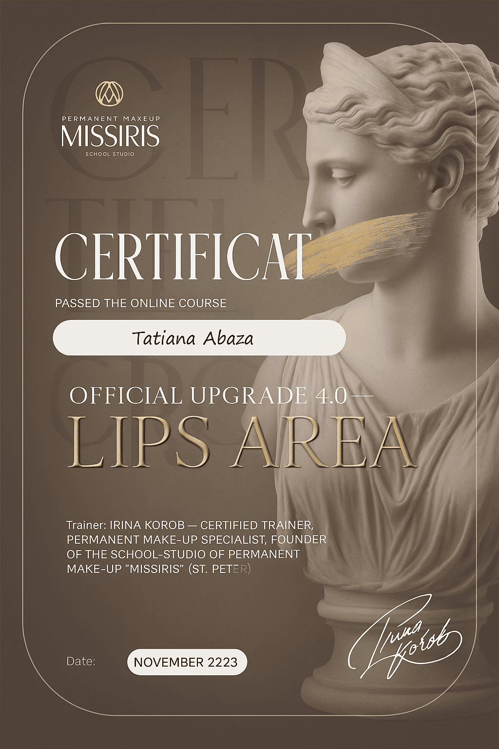 My experience allows me to correct eyebrows in any condition, handle even the most challenging cases, fix over-plucked brows, and bring them to a perfect result. Also address imperfections, fill gaps, and even out the color of your lips, creating harmonious shapes. Additionally, creating beautiful lashes with long-lasting and durable results. I always guide my clients through the process to ensure the final outcome is flawless. Over the years, I have completed more than 10,000 transformations, helping every woman feel confident and radiant.